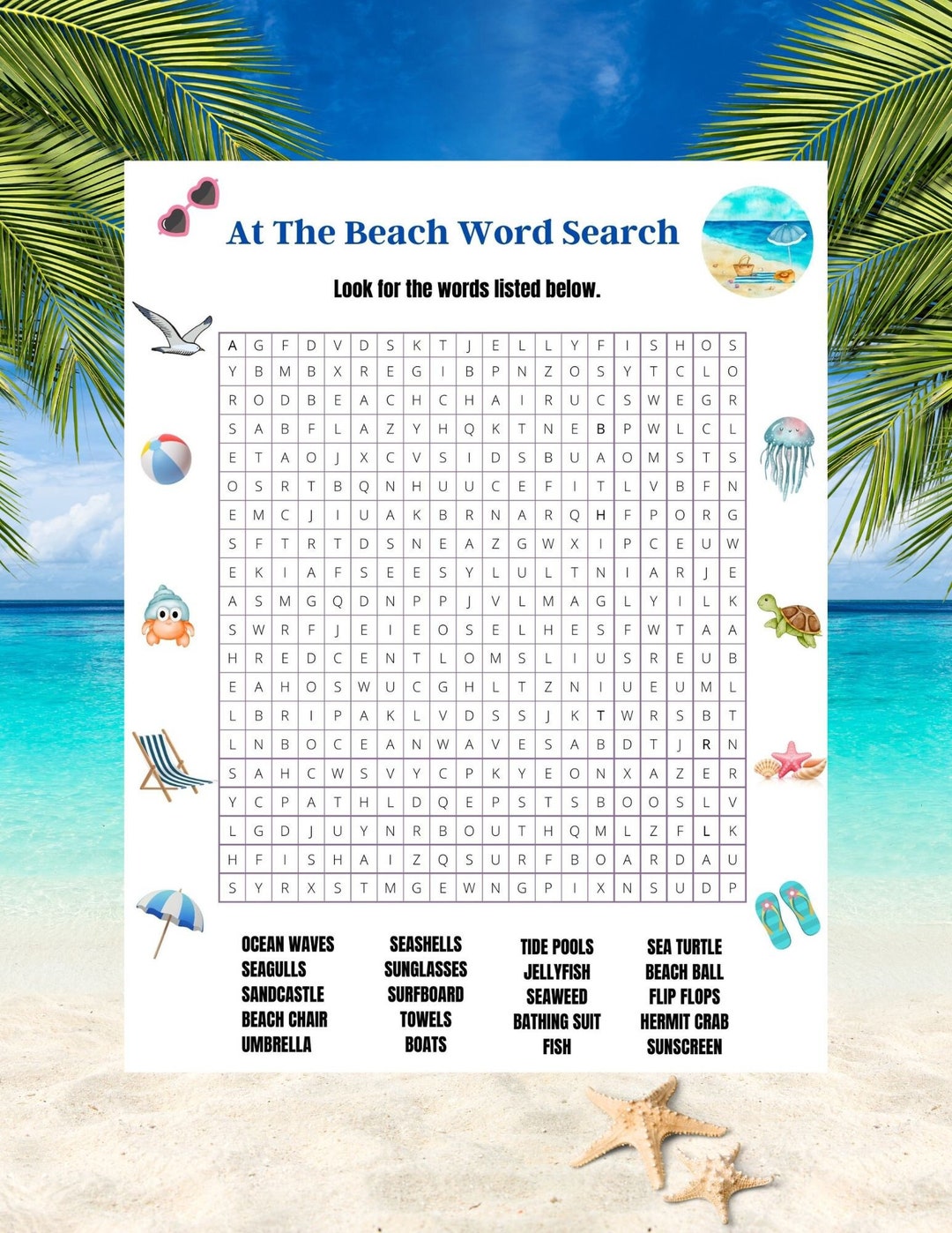- Visual appeal: A border of waves, palm trees, or flip-flops makes the puzzle feel festive, not like homework.