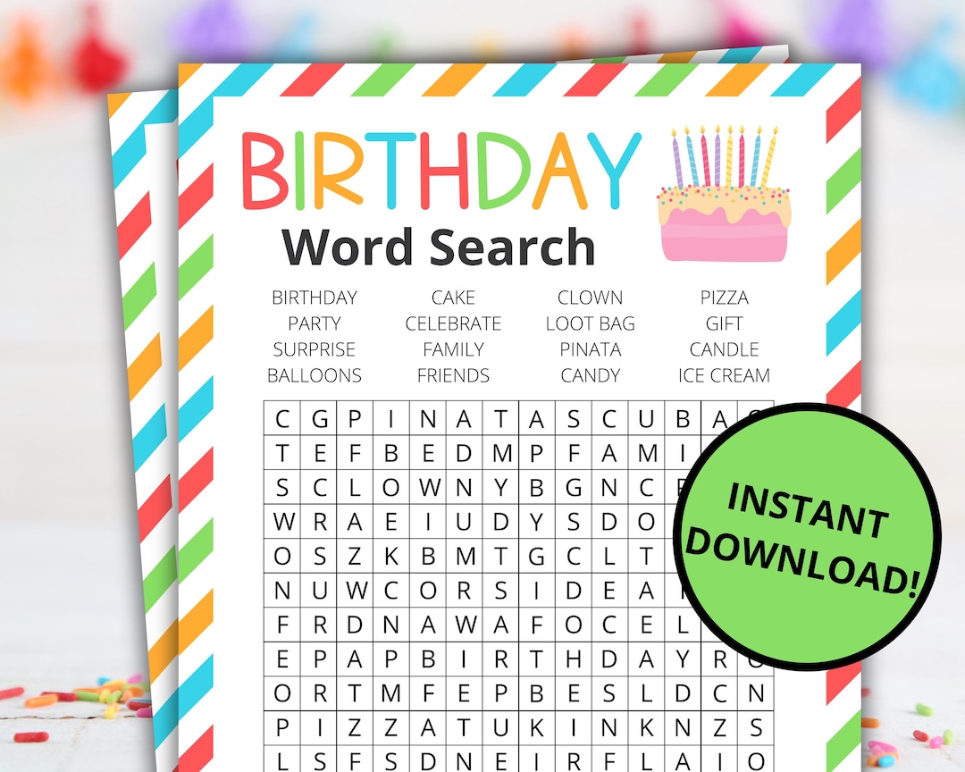 - Education.com: Offers themed word searches with birthday-related words, plus options to adjust difficulty.
