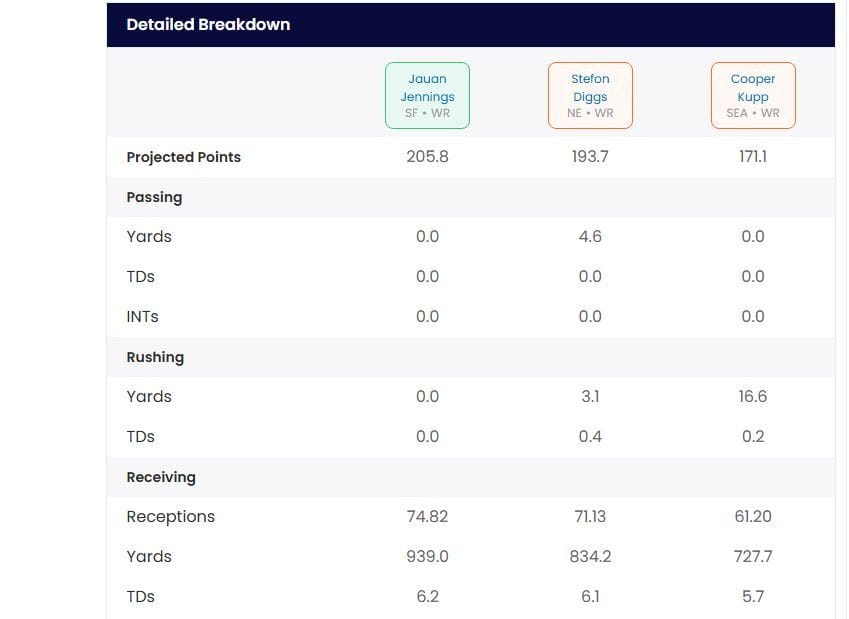 - High-End (Samuel misses 4+ games or Jennings earns more trust): 75 receptions, 900 yards, 8 TDs (WR20-25 range).