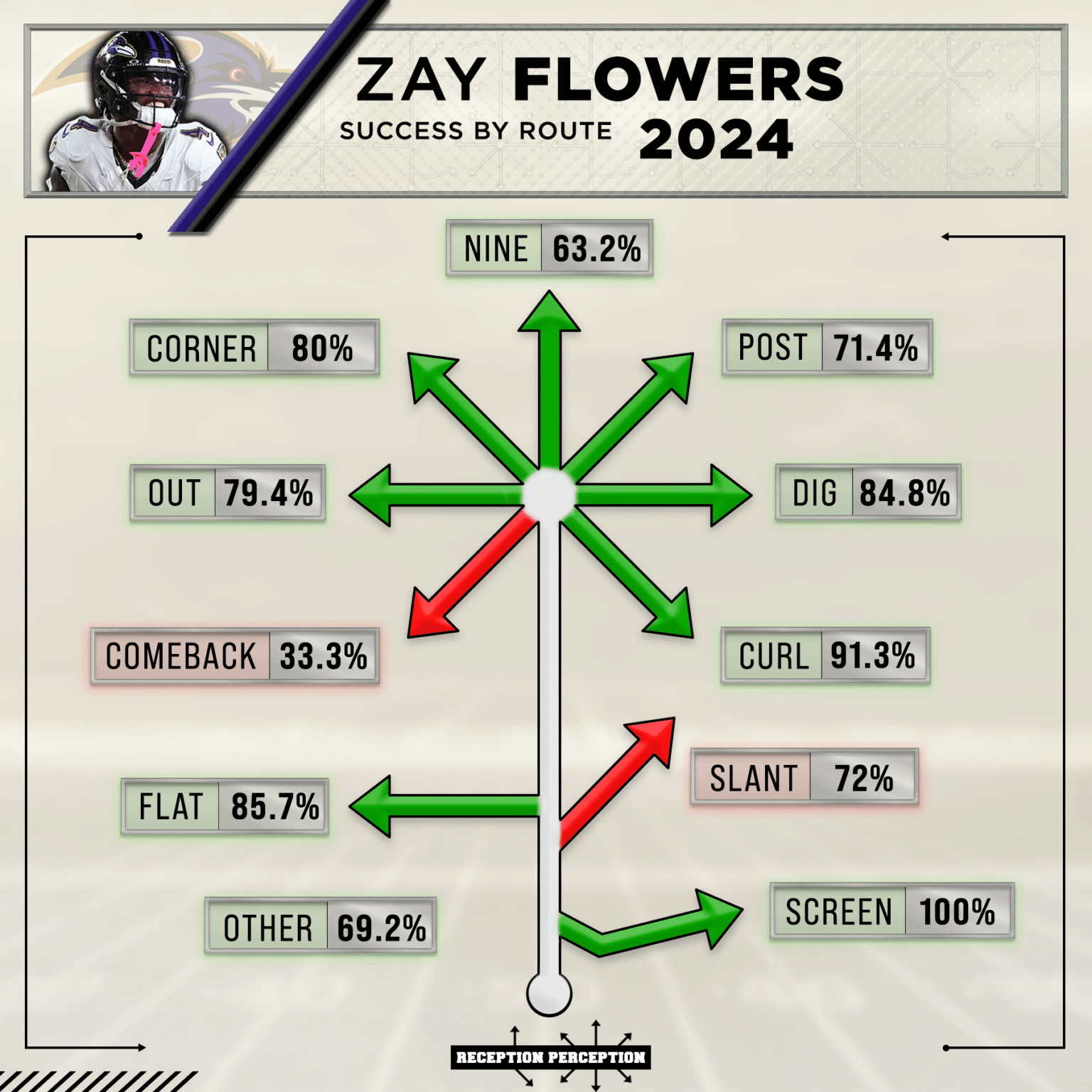 - Target Share: 22.4% (top-15 among WRs, despite Baltimore’s run-heavy offense).
